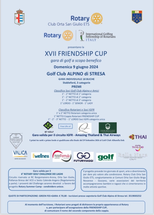 Domenica 9 Giugno saremo con Rotary - International Golfing Fellowship of Rotarians al Golf Club ALPINO di Stresa in occasione della Gara XVII FRIENDSHIP CUP - gara individuale 18 buche Stableford, 3 categorie