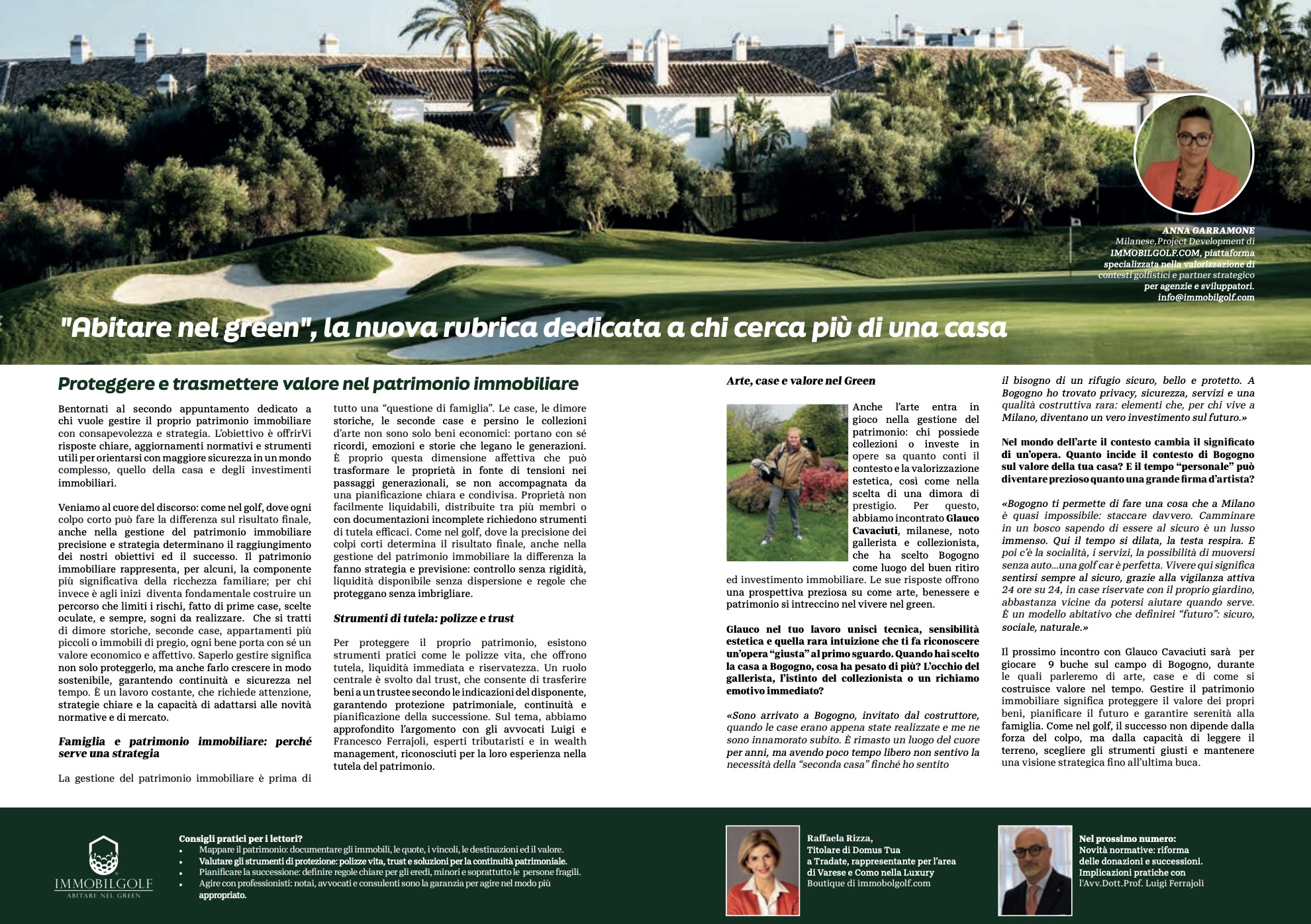 Il prossimo incontro con Glauco Cavaciuti sarà per giocare 9 buche sul campo di Bogogno, durante le quali parleremo di arte, case e di come si costruisce valore nel tempo. Gestire il patrimonio immobiliare significa proteggere il valore dei propri beni, pianificare il futuro e garantire serenità alla famiglia. Come nel golf, il successo non dipende dalla forza del colpo, ma dalla capacità di leggere il terreno, scegliere gli strumenti giusti e mantenere una visione strategica fino all’ultima buca. A.G.ImmobilGolf - Logo dorato